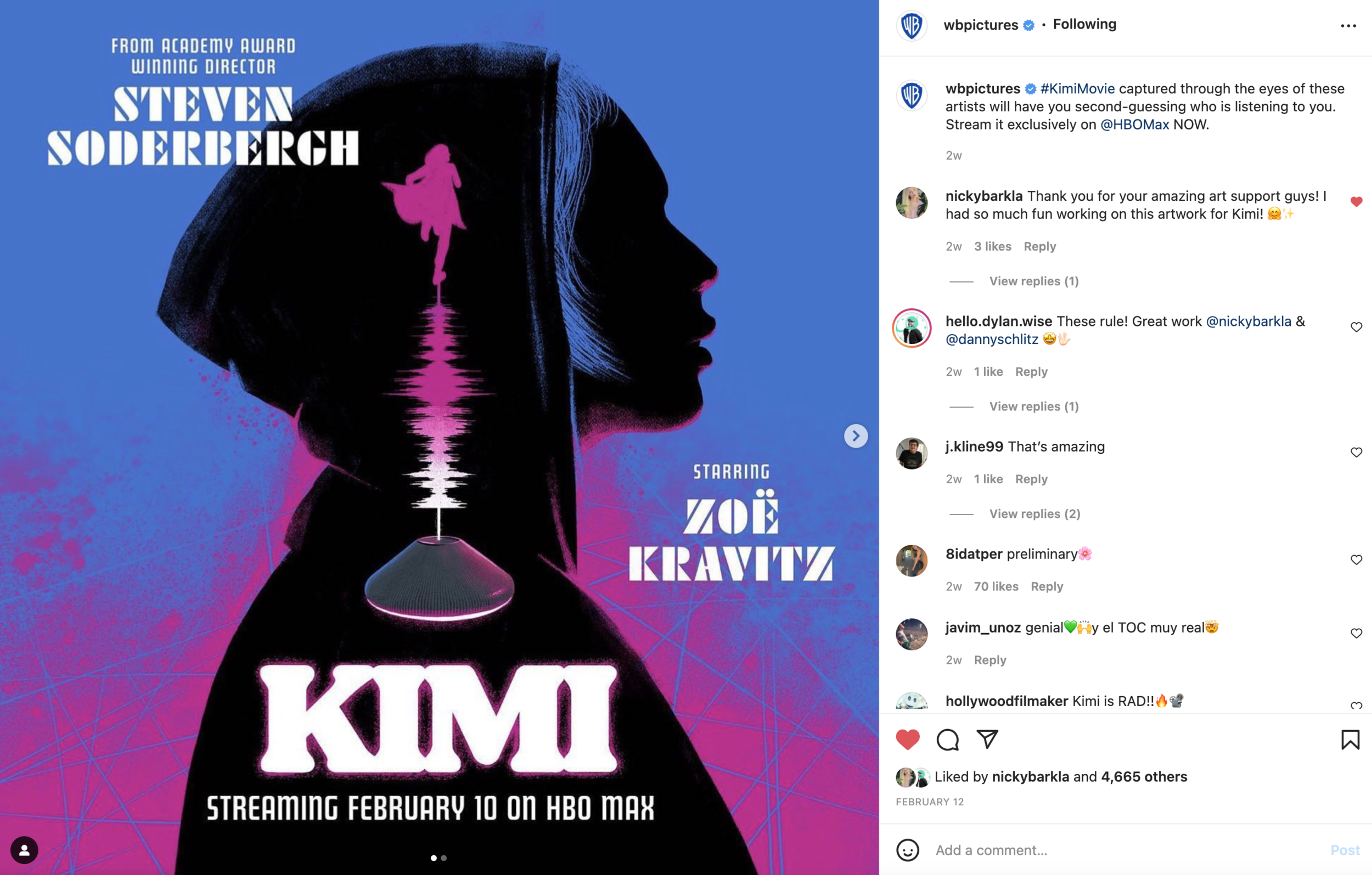 I was hired to create promotional artwork for the movie Kimi by Stephen Soderbergh, starring Zoë Kravitz. We wanted to draw from the Hitchcock era key art. Suspense and silhouettes to keep it direct and iconic.